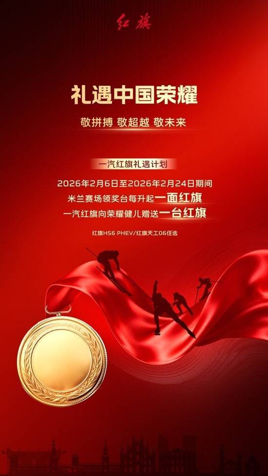 2026年2月6日至2026年2月24日期间,米兰赛场领奖台上每升起一面红旗,一汽红旗向荣耀健儿赠送一台红旗。