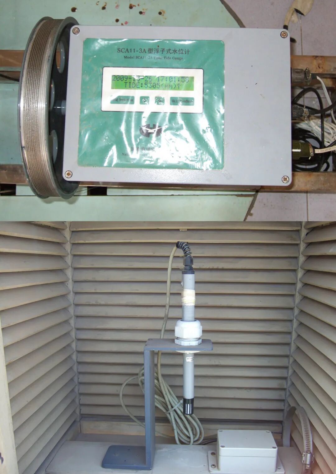 自动观测采集使用的水位计(上)和温湿度传感器(下)▼